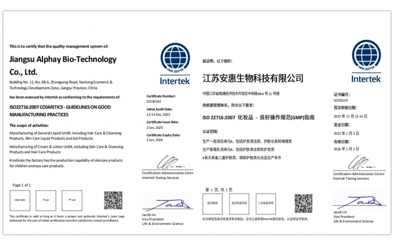 2023年1月,安惠公司化妝品生產(chǎn)系統(tǒng)順利通過認證公司Intertek的嚴格審核,獲得ISO22716質(zhì)量管理體系認證,即國際化妝品GMP認證。化妝品GMP管理系統(tǒng)的目標是通過對生產(chǎn)流程中的每項工作、每個環(huán)節(jié)和每道工序都進行高標準的規(guī)范和要求,消除和防止產(chǎn)品在制造過程中的質(zhì)量缺陷,避免化妝品產(chǎn)品對使用者的潛在危險;GMP認證的最大優(yōu)點是證實生產(chǎn)企業(yè)的廠房、人員、設(shè)施、材料的采購和使用及產(chǎn)品制造過程控制、工廠和人員衛(wèi)生管理、質(zhì)量管理體系均達到了世界先進水平。